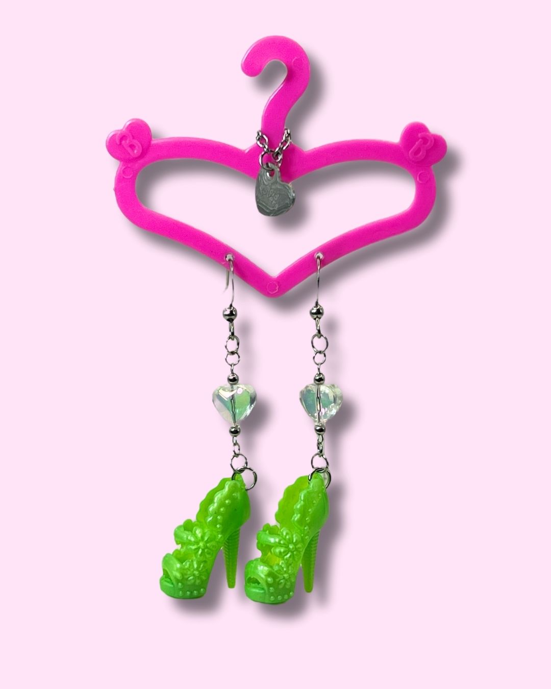 Dale un toque divertido a tu look con estos aros de Zapatos de Barbie verdes con flores.