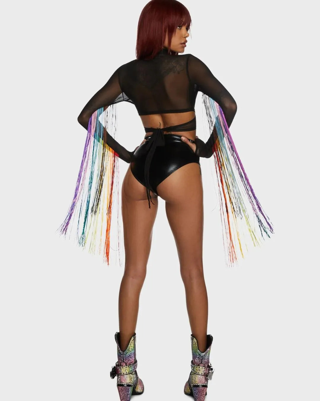Top Crop cruzado con flecos arcoiris .